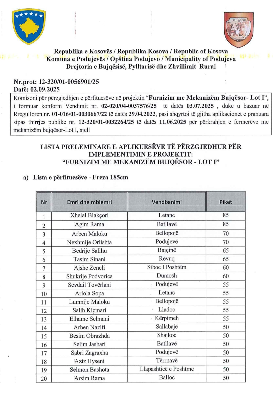 Komuna e Podujevës ka shpallur listën preliminare të përfituesve të projektit “Furnizim me Mekanizëm Bujqësor – Lot I”.