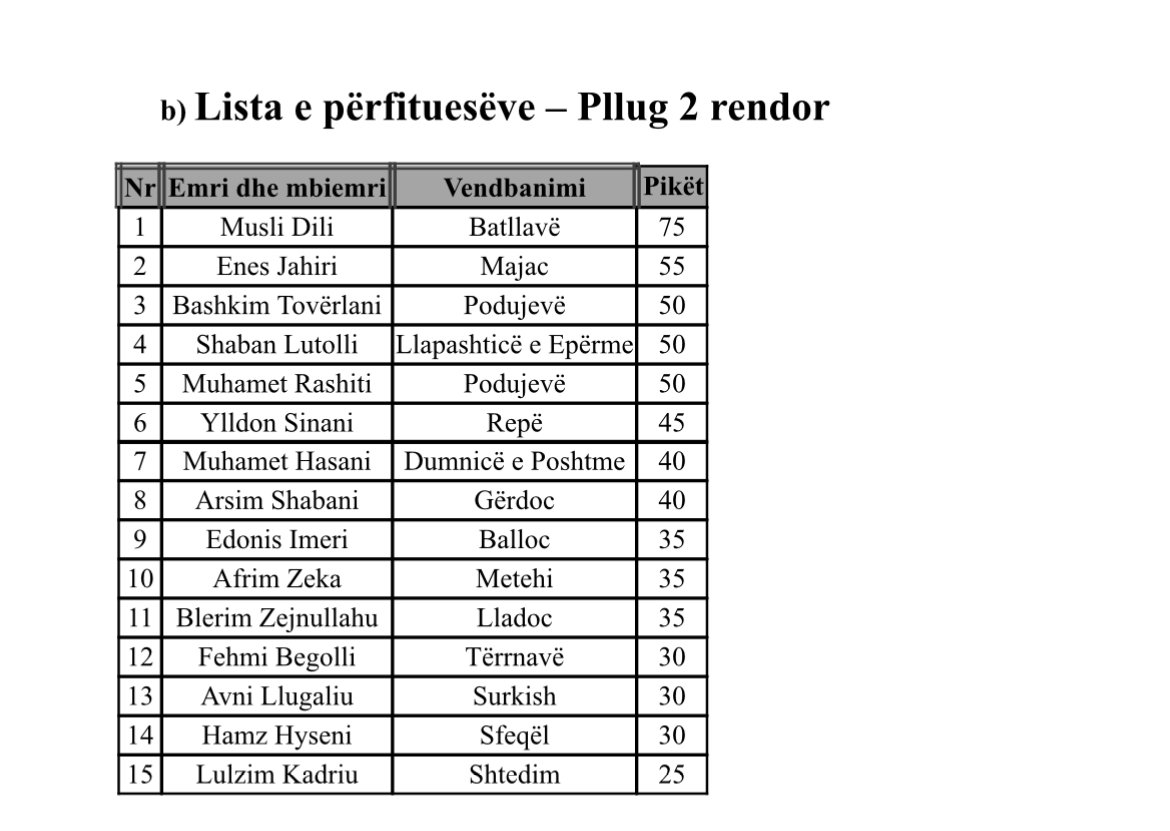 Podujeva Podujevë: Këta janë përfituesit e “pllug 2 rendor” September 4, 2025 Komuna e Podujevës ka publikuar listën e përfituesëve për “pllug 2 rendor”. Më poshtë lista: Post navigation Previous: Podujevë: Këta janë përfituesit e frezaveNext: Podujevë: Këta janë përfituesit e projektit “mbledhëse bari luledielli”