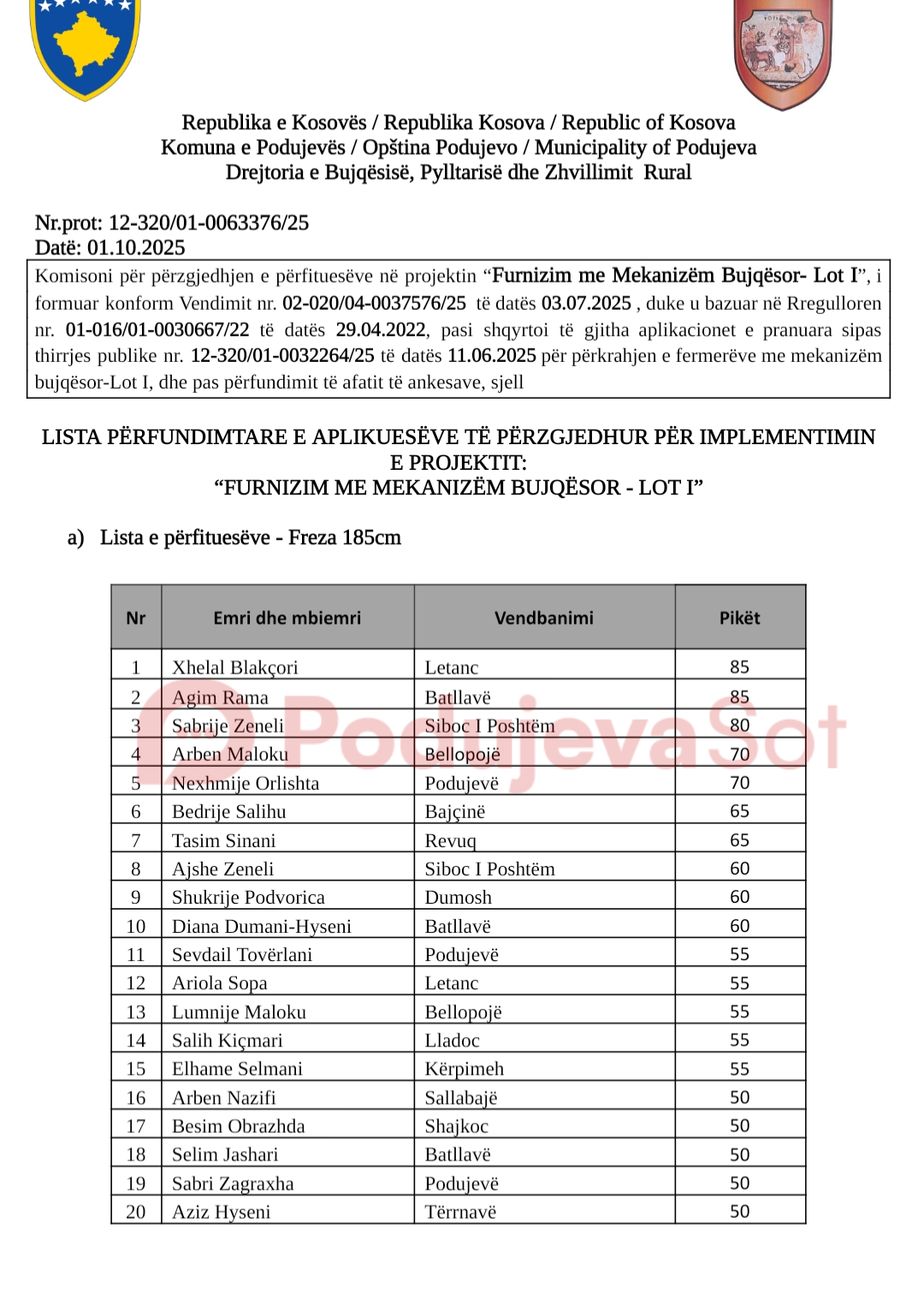 Komuna e Podujevës ka shpallur listën përfundimtare të përfituesve nga projekti “Furnizim me Mekanizëm Bujqësor – Lot I”.