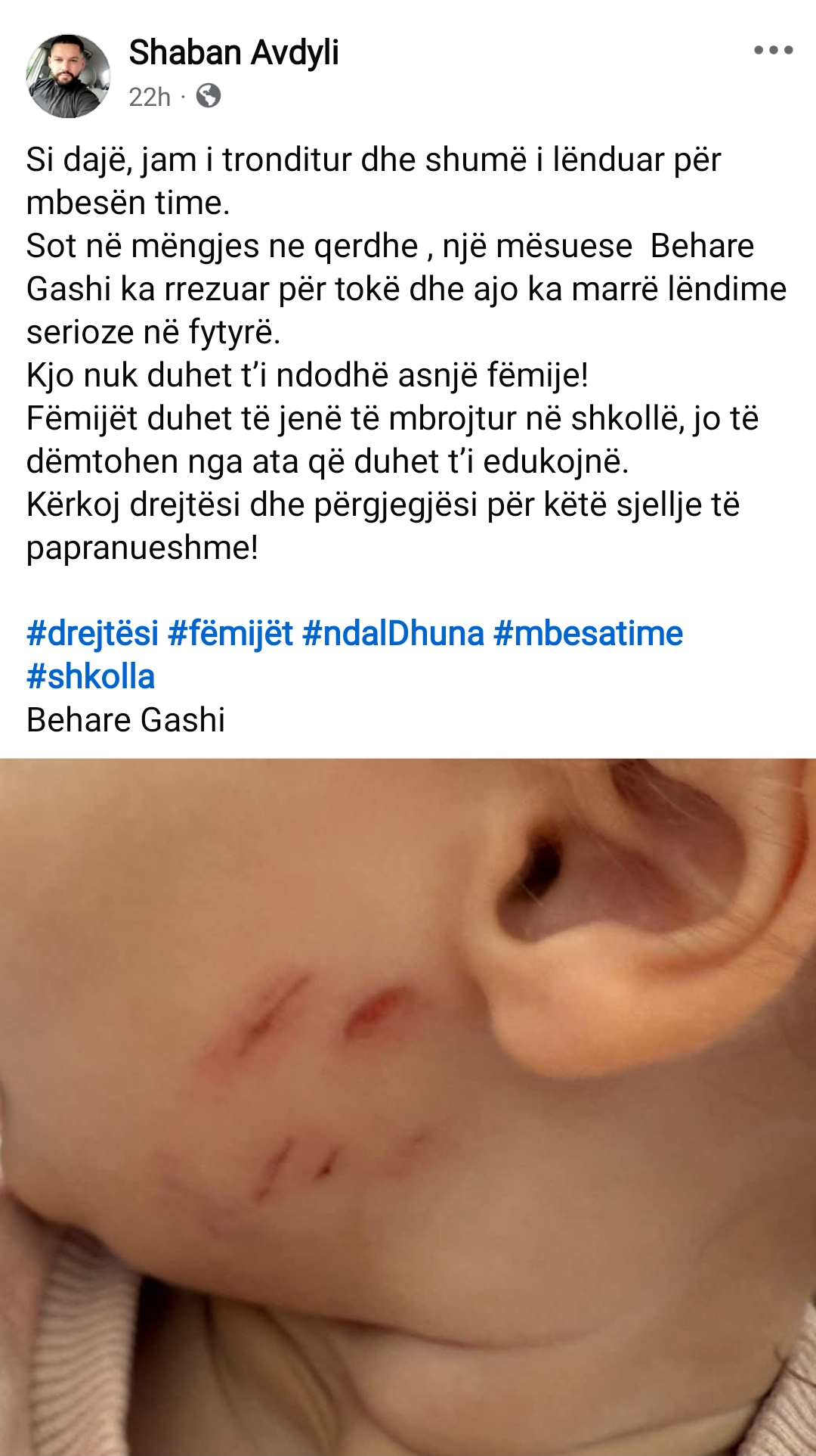 Rastin fillimisht e ka bërë të ditur daja i vogëlushes, nëpërmjet një postimi në Facebook ku ka postuar edhe fotografinë që tregon lëndimin e saj në zonën e qafës.