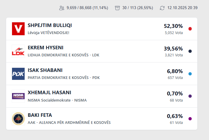 Podujeva Përditësimi i fundit, Bulliqi rritet edhe më shumë October 12, 2025 Rezultati momental në Podujevë. Më poshtë rezultati: Post navigation Previous: Rezultati i zgjedhjeve në BuricëNext: Rezultati i zgjedhjeve në Letanc