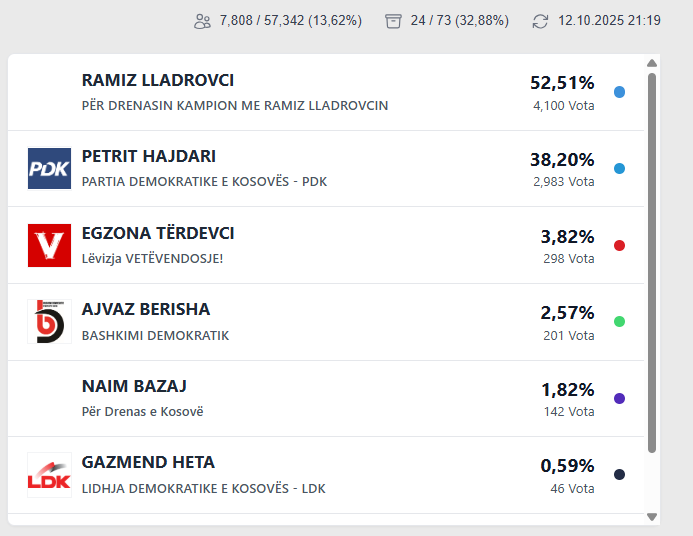 Lajme Ramiz Lladrovci po prin bindshëm në rezultatet e para October 12, 2025 Ramiz Lladrovci po prin bindshëm në rezultatet e para. Më poshtë rezultati momental: Post navigation Previous: Hyseni bie për 1%, Bulliqi rritet për 1%Next: Rezultati i zgjedhjeve në Peran