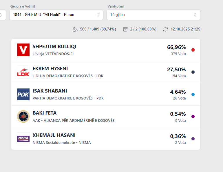 Podujeva Rezultati i zgjedhjeve në Peran October 12, 2025 Rezultati i zgjedhjeve në Peran Më poshtë rezultati: Post navigation Previous: Ramiz Lladrovci po prin bindshëm në rezultatet e paraNext: Rezultati i zgjedhjeve në Llugë