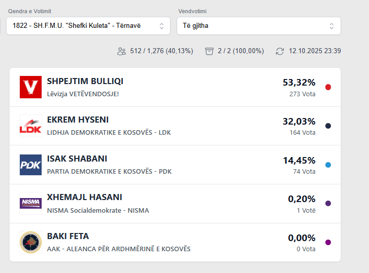 Podujeva Rezultati i zgjedhjeve në Tërnavë October 12, 2025 Rezultati i zgjedhjeve në Tërnavë Më poshtë rezultati: Post navigation Previous: Rezultati i zgjedhjeve në ShtedimNext: Rezultati i zgjedhjeve në Orllan