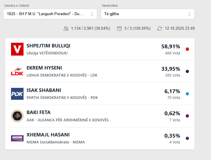 Podujeva Rezultati i zgjedhjeve në Dumnicë të Poshtme October 12, 2025 Rezultati i zgjedhjeve në Dumnicë të Poshtme Më poshtë rezultati: Post navigation Previous: Rezultati i zgjedhjeve në MajacNext: Rezultati i zgjedhjeve në Obrançë