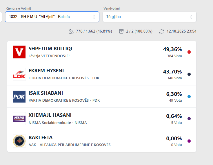 Podujeva Rezultati i zgjedhjeve në Balloc October 12, 2025 Rezultati i zgjedhjeve në Balloc Më poshtë rezultati: Post navigation Previous: Rezultati i zgjedhjeve në LupçNext: Rezultati i zgjedhjeve në Dobërdol