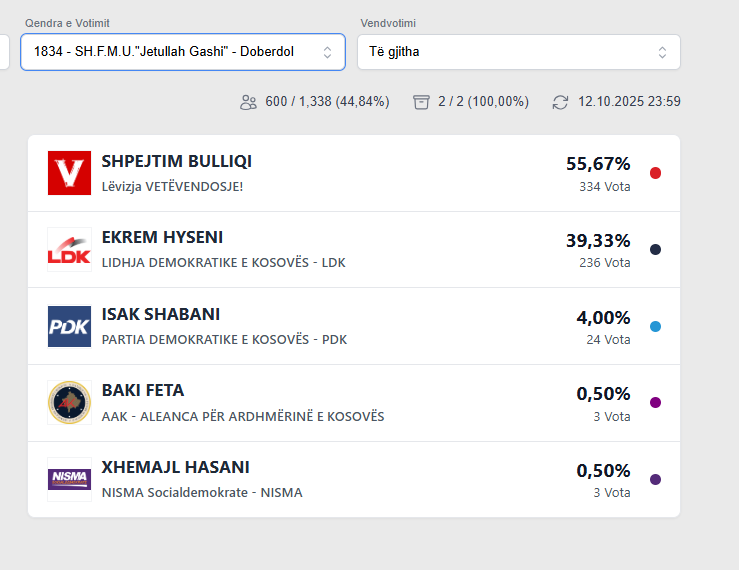 Podujeva Rezultati i zgjedhjeve në Dobërdol October 12, 2025 Rezultati i zgjedhjeve në Dobërdol Më poshtë rezultati: Post navigation Previous: Rezultati i zgjedhjeve në BallocNext: LAJMI I FUNDIT: Përfundon numërimi në Mitrovicë