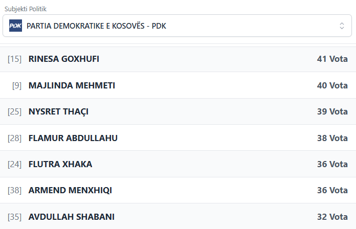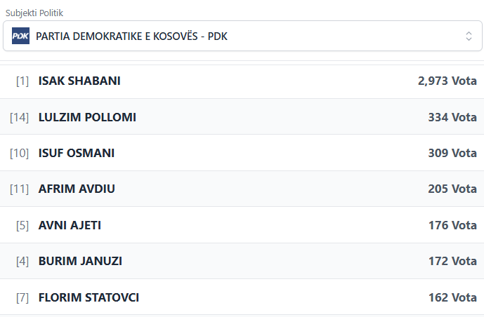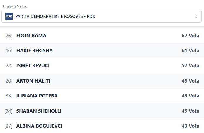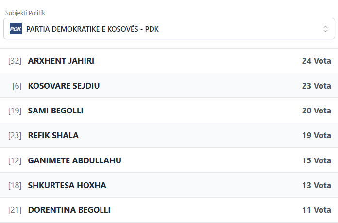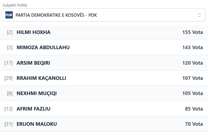 PodujevaSot është duke publikuar rezultatet e partive dhe kandidatëve më të votuar të PDK-së.