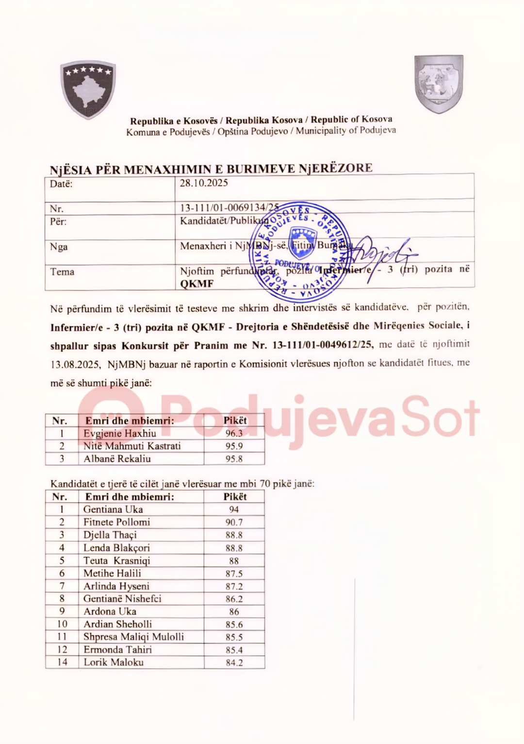 Në njoftimin zyrtar të datës 28 tetor 2025, bëhet e ditur se pas përfundimit të testit me shkrim dhe intervistës janë përzgjedhur kandidatët me më së shumti pikë për tri pozitat e shpallura në Drejtorinë e Shëndetësisë dhe të Mirëqenies Sociale, raporton Podujeva Sot.