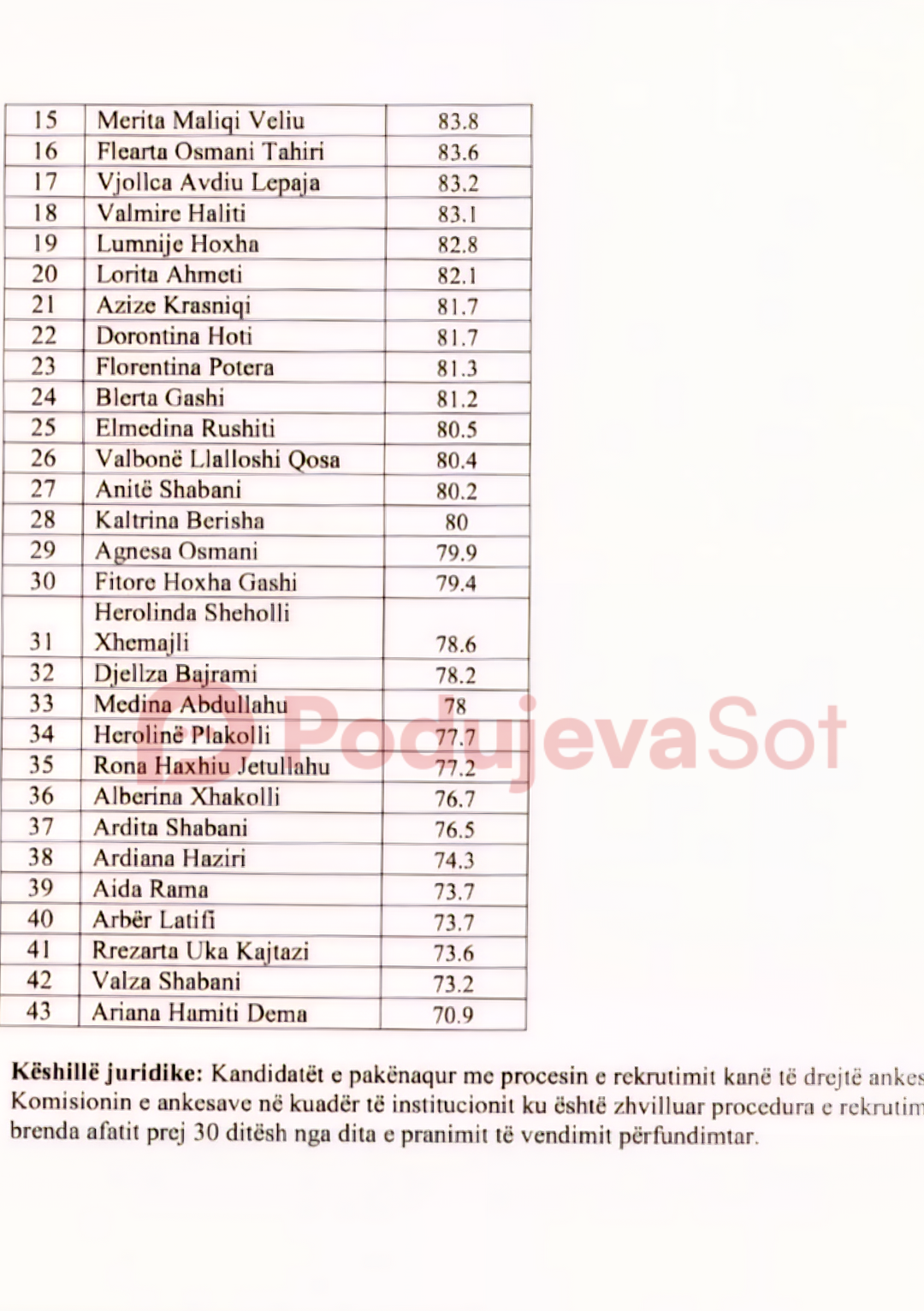 Në listë janë përfshirë edhe disa kandidatë të tjerë që kanë arritur mbi 70 pikë në procesin e vlerësimit, raporton Podujeva Sot. Më poshtë lista e plotë: