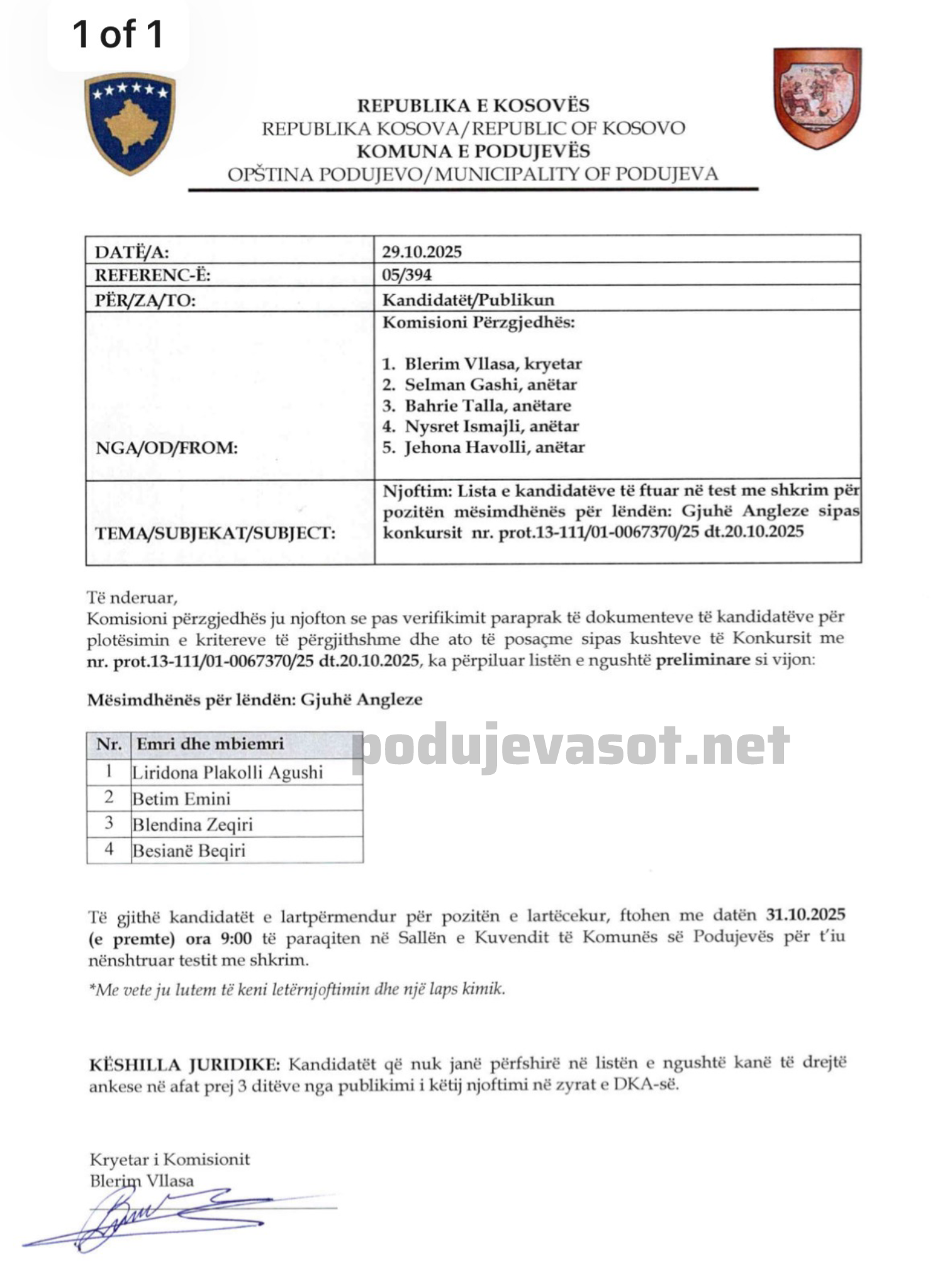Podujevë: Këta janë të ftuarit në test me shkrim për “Mësimdhënës i Gjuhës Angleze”.