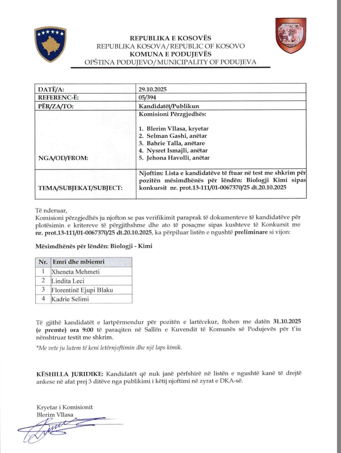 Podujevë: Këta janë të ftuarit në test me shkrim për mësimdhënës në Biologji – Kimi.
