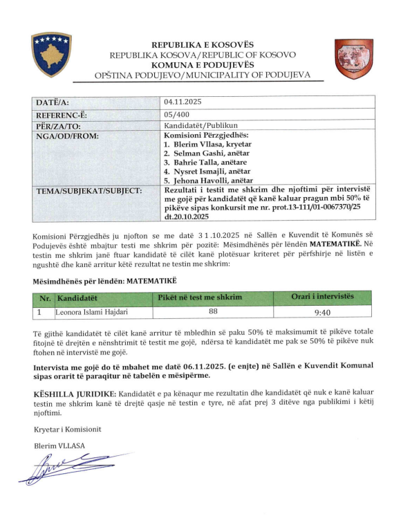 Komuna e Podujevës ka publikuar rezultatet e testit me shkrim për pozitën “Mësimdhënës i Matematikës”.