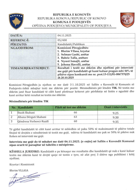Komuna e Podujevës ka publikuar rezultatet e testit me shkrim për pozitën “Mësimdhënës i TIK-ut”.