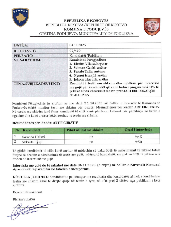 Komuna e Podujevës ka publikuar rezultatet e testit me shkrim për pozitën “Mësimdhënës i ART-it”.