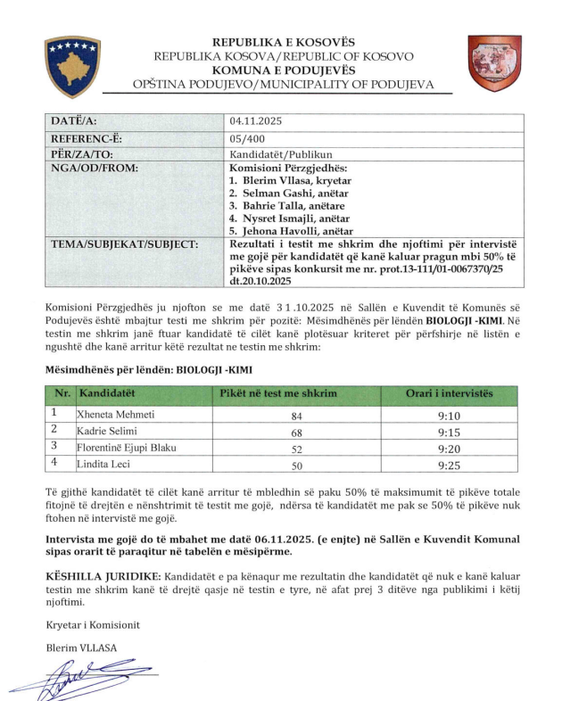 Komuna e Podujevës ka publikuar rezultatet e testit me shkrim për pozitën “Mësimdhënës i Biologjisë”.
