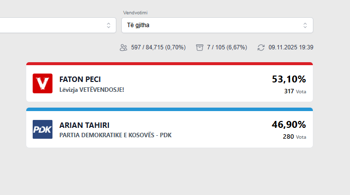 Lajme 6% të numëruara, Peci bindshëm i pari November 9, 2025 Janë numëruar 6% e votave në Mitrovicë. Më poshtë rezultati: Post navigation Previous: Ymeri: E pritshme fitorja e Përparim Ramës në PrishtinëNext: 10% të numëruara në Prishtinë, ky është rezultati