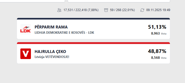 Lajme 22% të numëruara, ngushtohet diferenca në Prishtinë November 9, 2025 Janë numëruar 22% e votave në Prishtinë. Më poshtë rezultati momental: Post navigation Previous: 58% për momentin Faton Peci, kaq % janë të numëruaraNext: “Lujta o Ramiz”, Muharremaj telefonon live Ramiz Lladrovcin