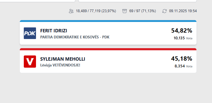 Lajme 71% të numëruara në Vushtrri, ky është rezultati November 9, 2025 Janë numëruar mbi 50% e votave në Vushtrri. Më poshtë rezultati: Post navigation Previous: “Lujta o Ramiz”, Muharremaj telefonon live Ramiz LladrovcinNext: Numërohen gjysma e votave në Prishtinë, ky është rezultati