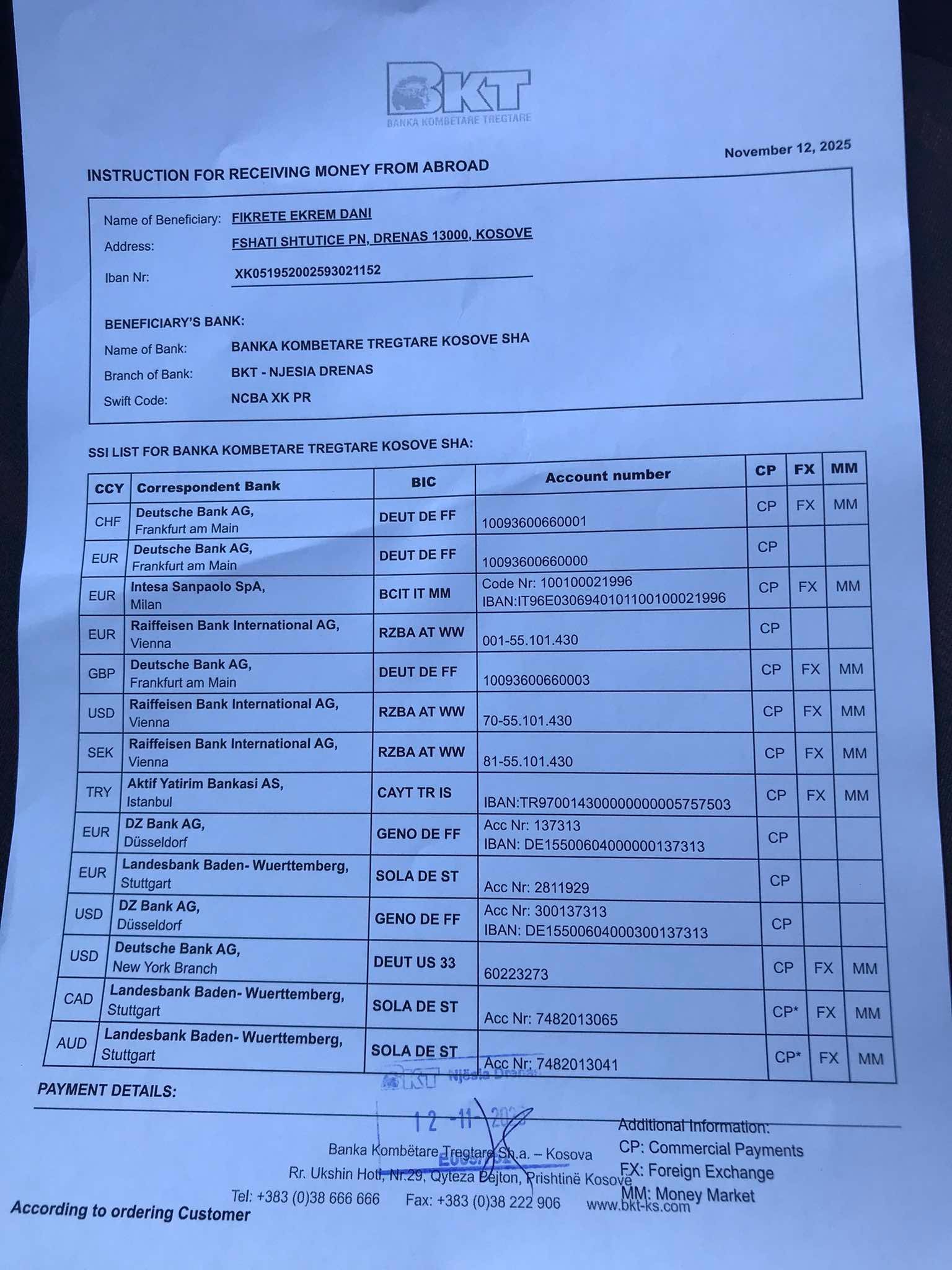⭕️Wester Union, MANYGRAM DHE RIA në emër të Fikrete Dani Nëna e Rinesës