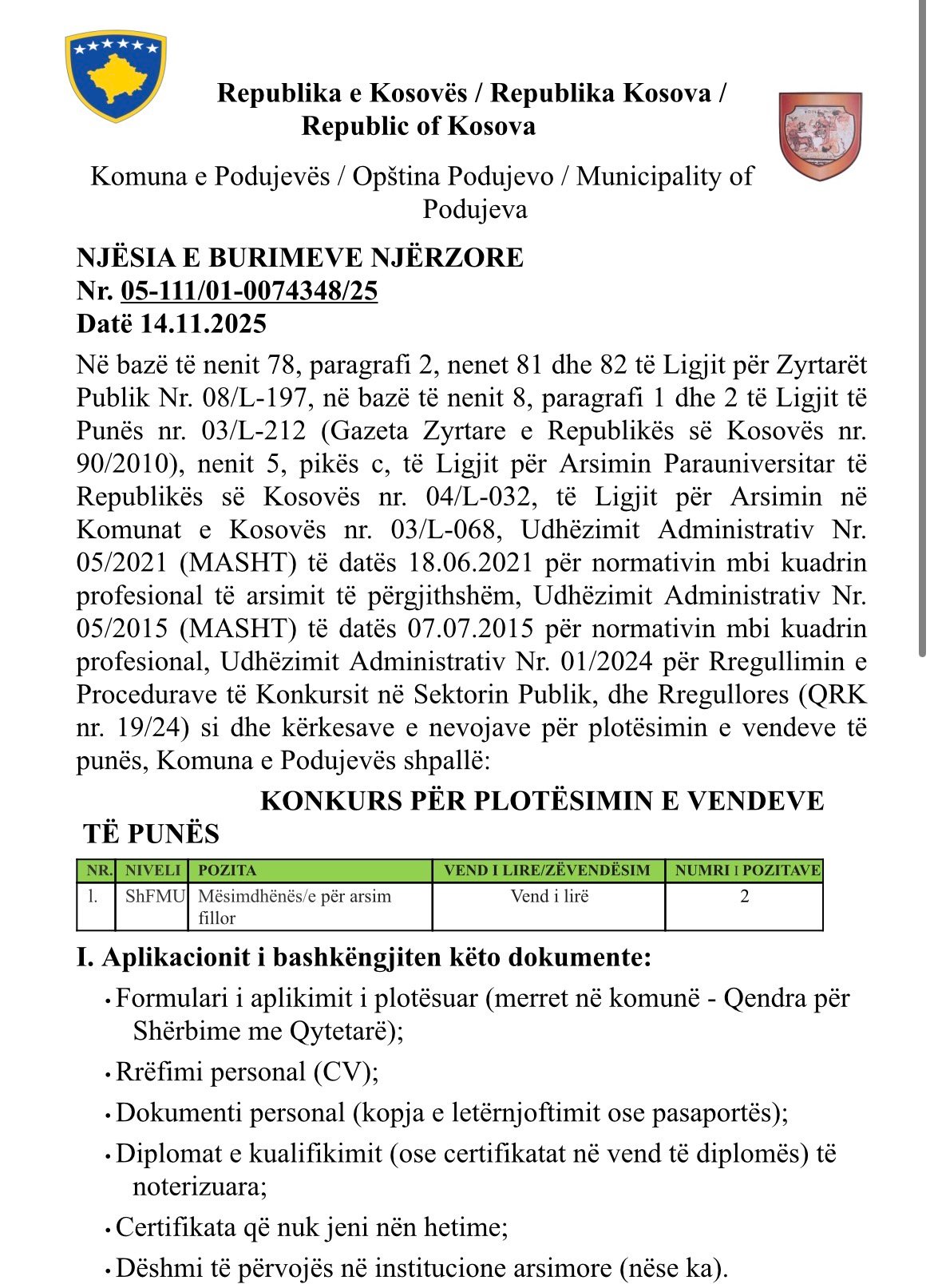 Komuna e Podujevës ka njoftuar për hapjen e një konkursi për mësimdhënës.