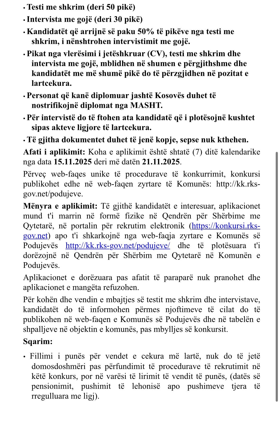 Më poshtë njoftimi nga Komuna e Podujevës: