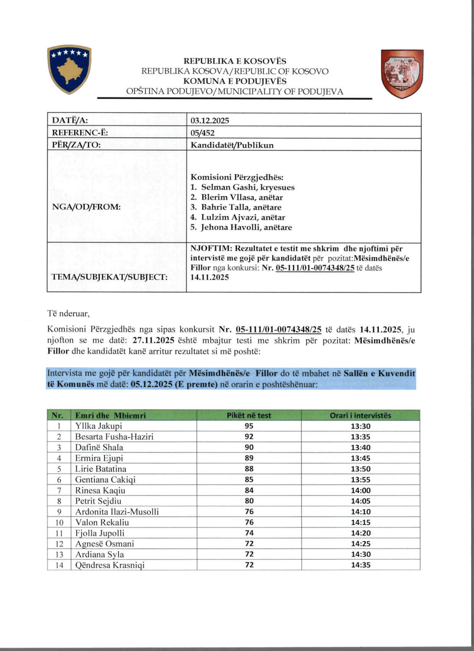 Komuna e Podujevës ka publikuar rezultatet me shkrim për pozitën “Mësimdhënës Fillor”.