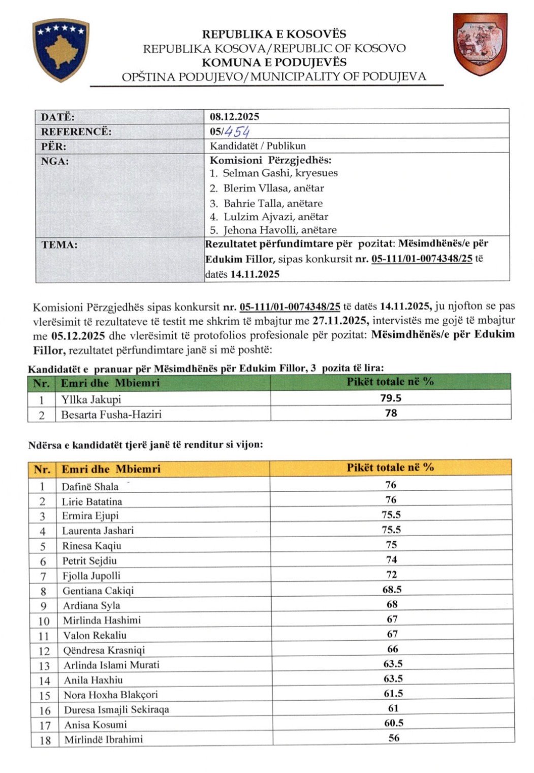 Podujevë: Rezultatet përfundimtare për mësimdhënës