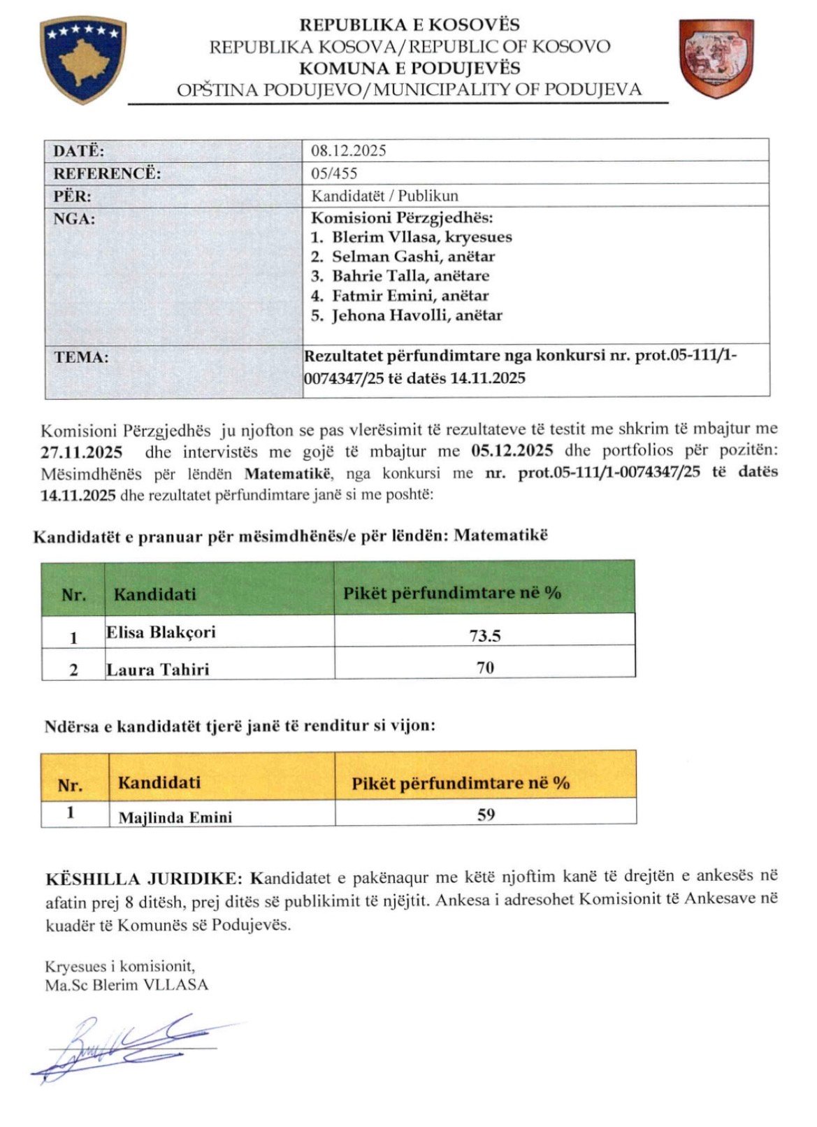 Komuna e Podujevës ka publikuar rezultatet përfundimtare për mësimdhënës të matematikës.