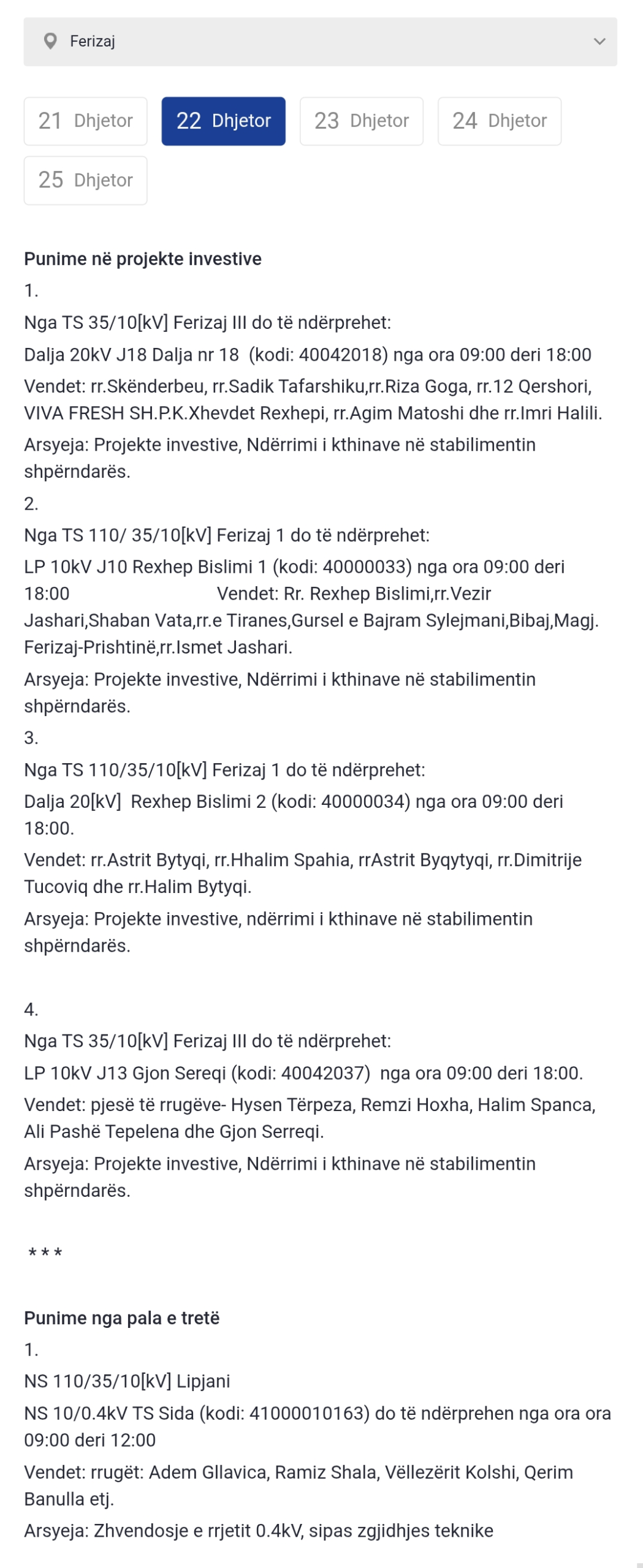 Më poshtë lista e plotë e vendeve që mbesin pa rrymë:
