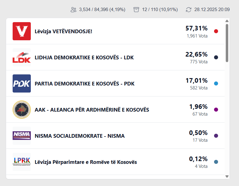 Podujeva Numërohen 10% në Podujevë, VV me fitore masive December 28, 2025 Janë numëruar 10% të votave në Podujevë. Më poshtë rezultati: Post navigation Previous: Numërohen 5%, ky është rezultatiNext: “Lirim, a je mirë o vlla”, Panduri drejtuar Lirim Mehmetajt Lajme që nuk duhet të humbin Podujeva Dy aksidente me tre të lënduar në Podujevë February 15, 2026 Podujeva Aksident në fshatin Lluzhan të Podujevës February 15, 2026 Podujeva Aksident në rrugën Podujevë – Prishtinë February 15, 2026