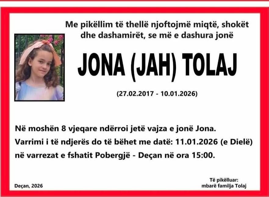 Lajme Ndërron jetë Jona në moshën 8 vjeçare January 11, 2026 Ka ndërruar jetë Jona Tolaj. Më poshtë njoftimi: NJOFTIM Post navigation Previous: Aksident tragjik në vend, makina përplas për vdekje 55-vjeçarinNext: Parashikimi i motit për sot Lajme që nuk duhet të humbin Lajme Theret me thikë një i mitur, niset për QKUK January 13, 2026 Lajme Numër i madh i vendeve do të mbesin pa rrymë nesër (e mërkure, 14.01.2026) January 13, 2026 Lajme Jehona Lushaku flet për dorëheqjen e mundshme të Lumir Abdixhikut January 13, 2026
