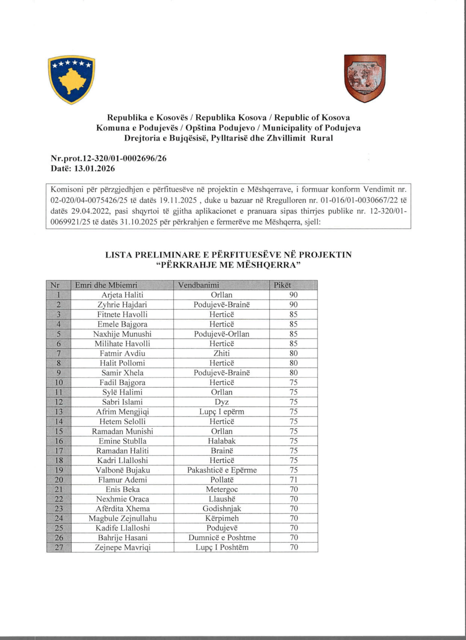 Komuna e Podujevës ka publikuar listën e përfituesëve të mëshqerrave.