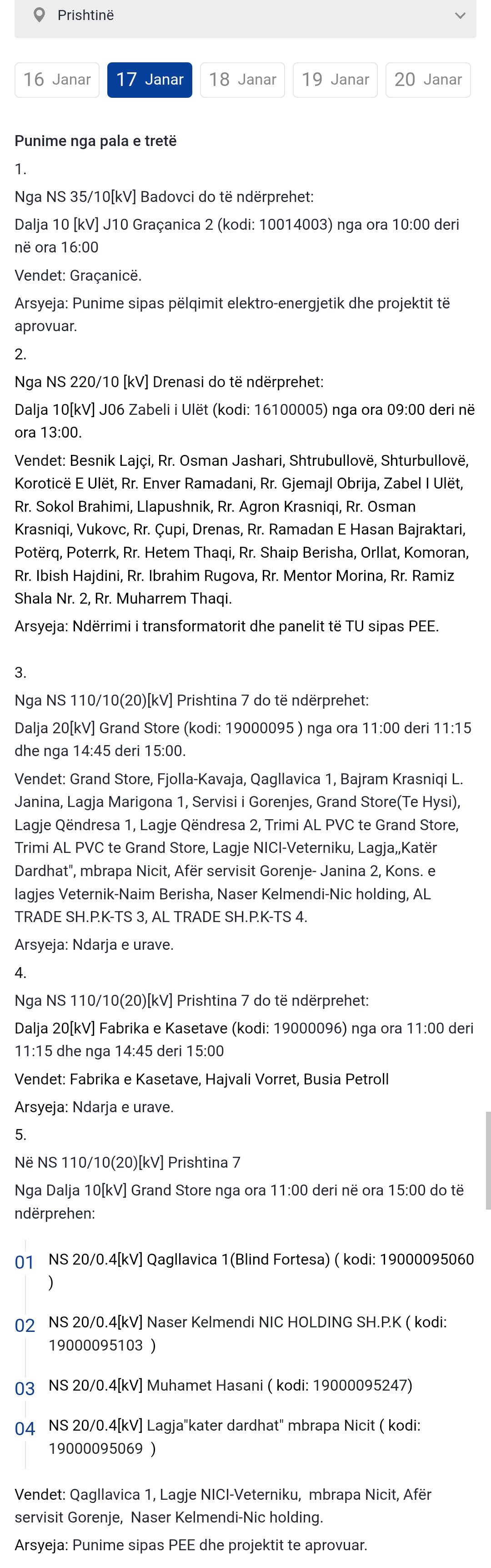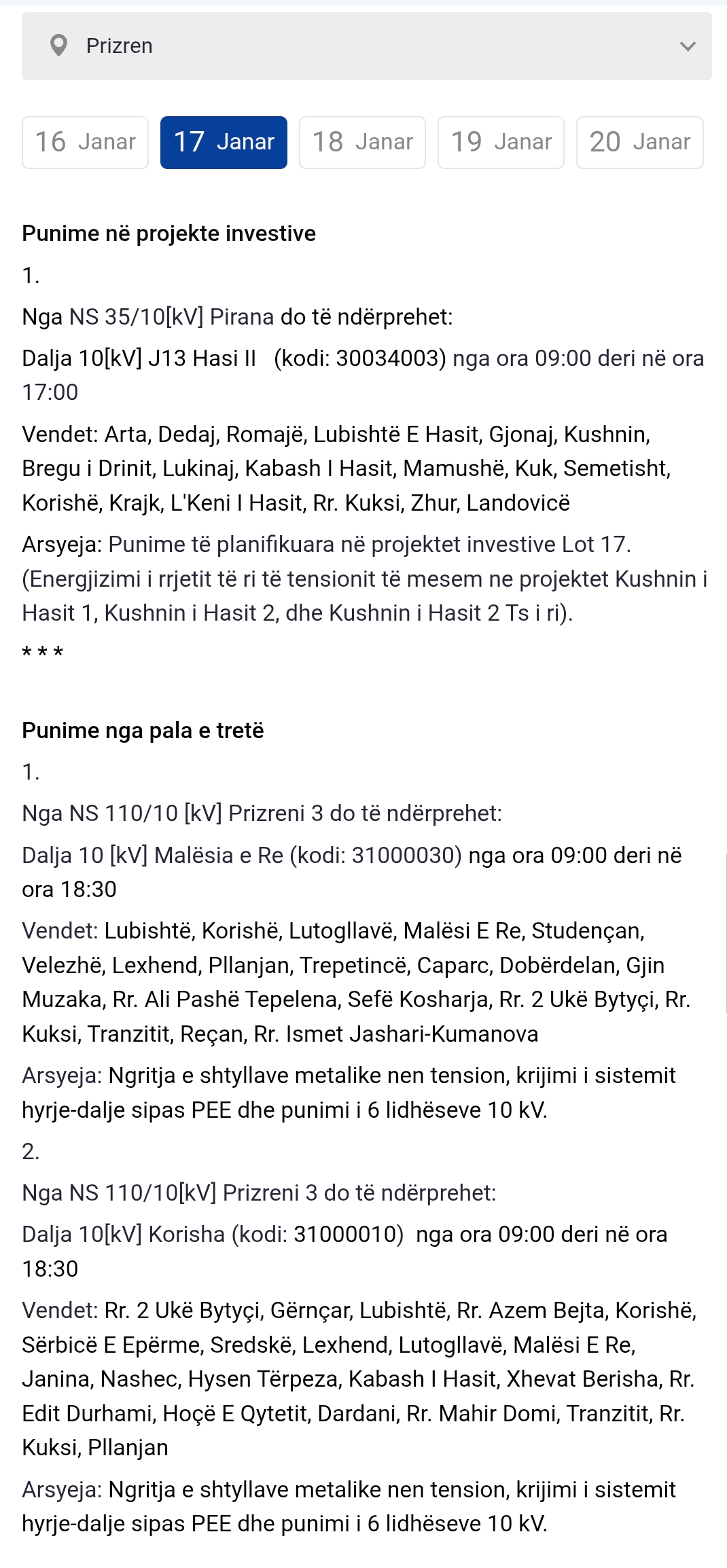 Më poshtë lista e plotë e vendeve që mbesin pa rrymë: