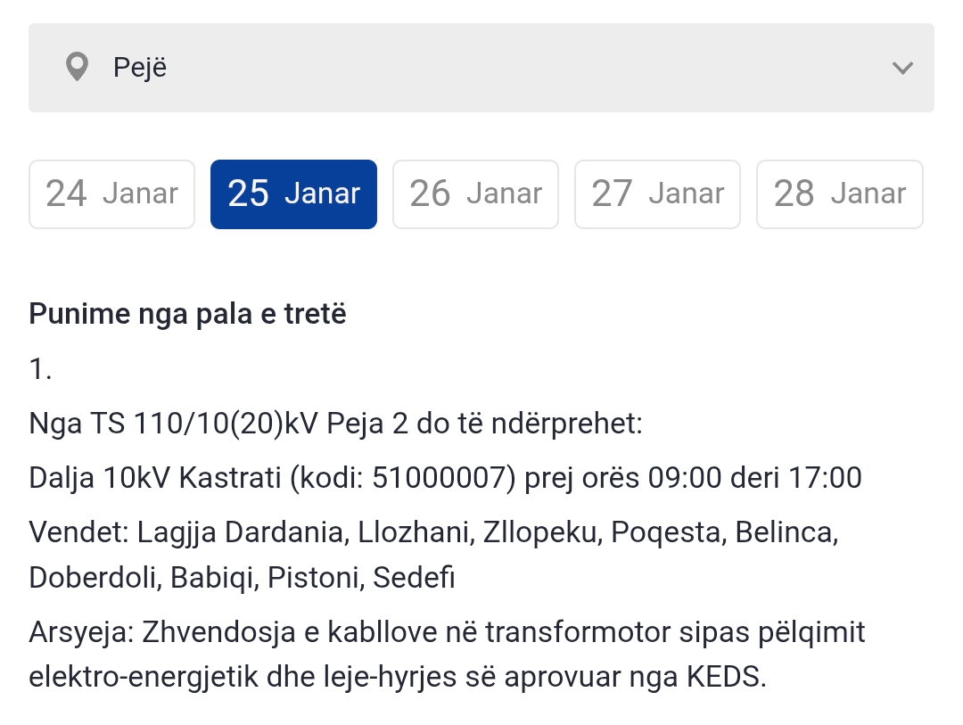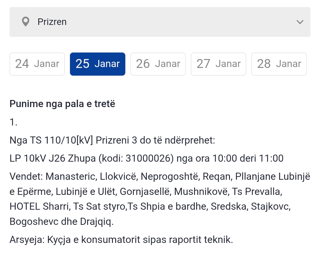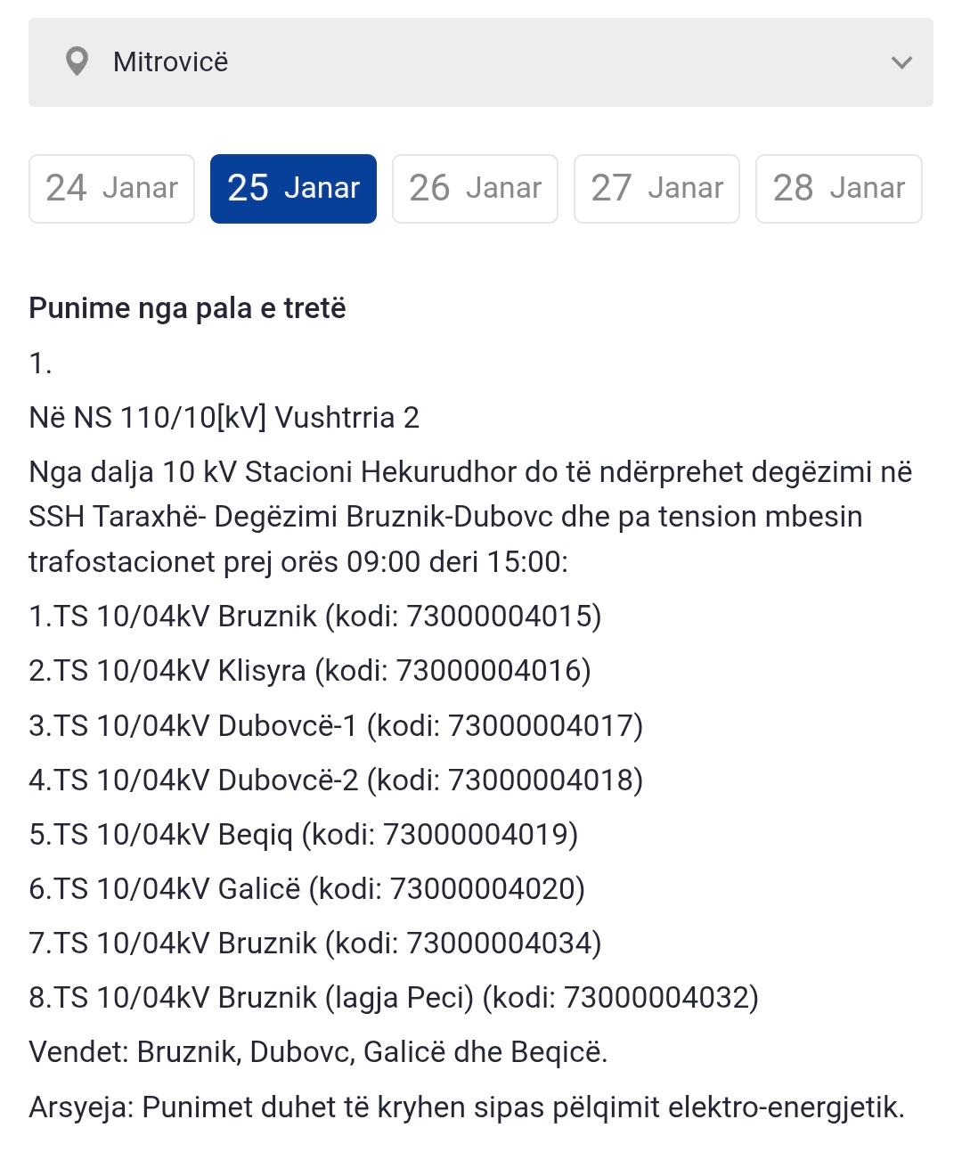 Këto vende të Kosovës do të mbesin pa rrymë (e diel, 25.01.2026)