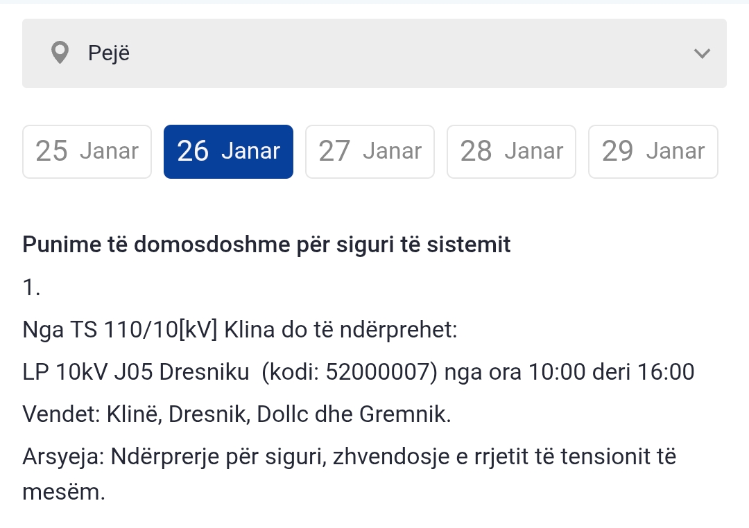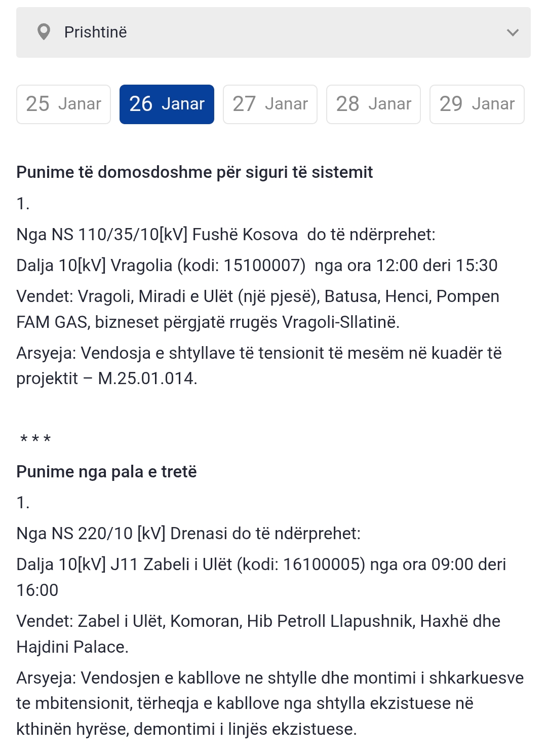 Më poshtë lista e plotë e vendeve që mbesin pa rrymë: