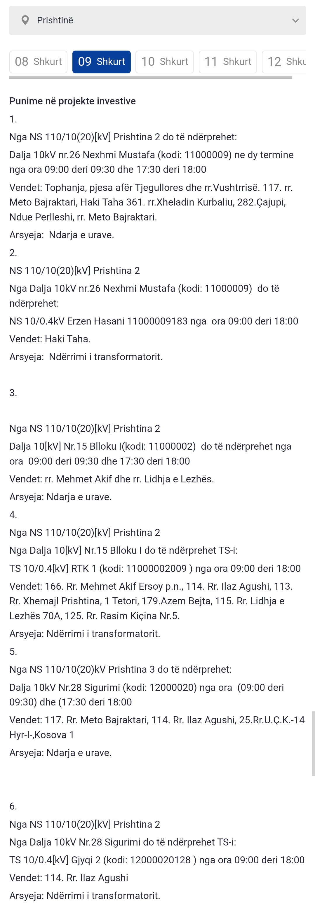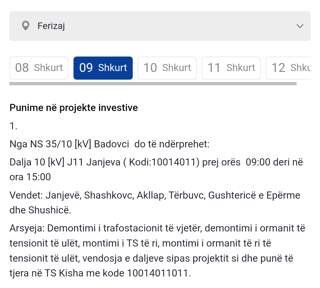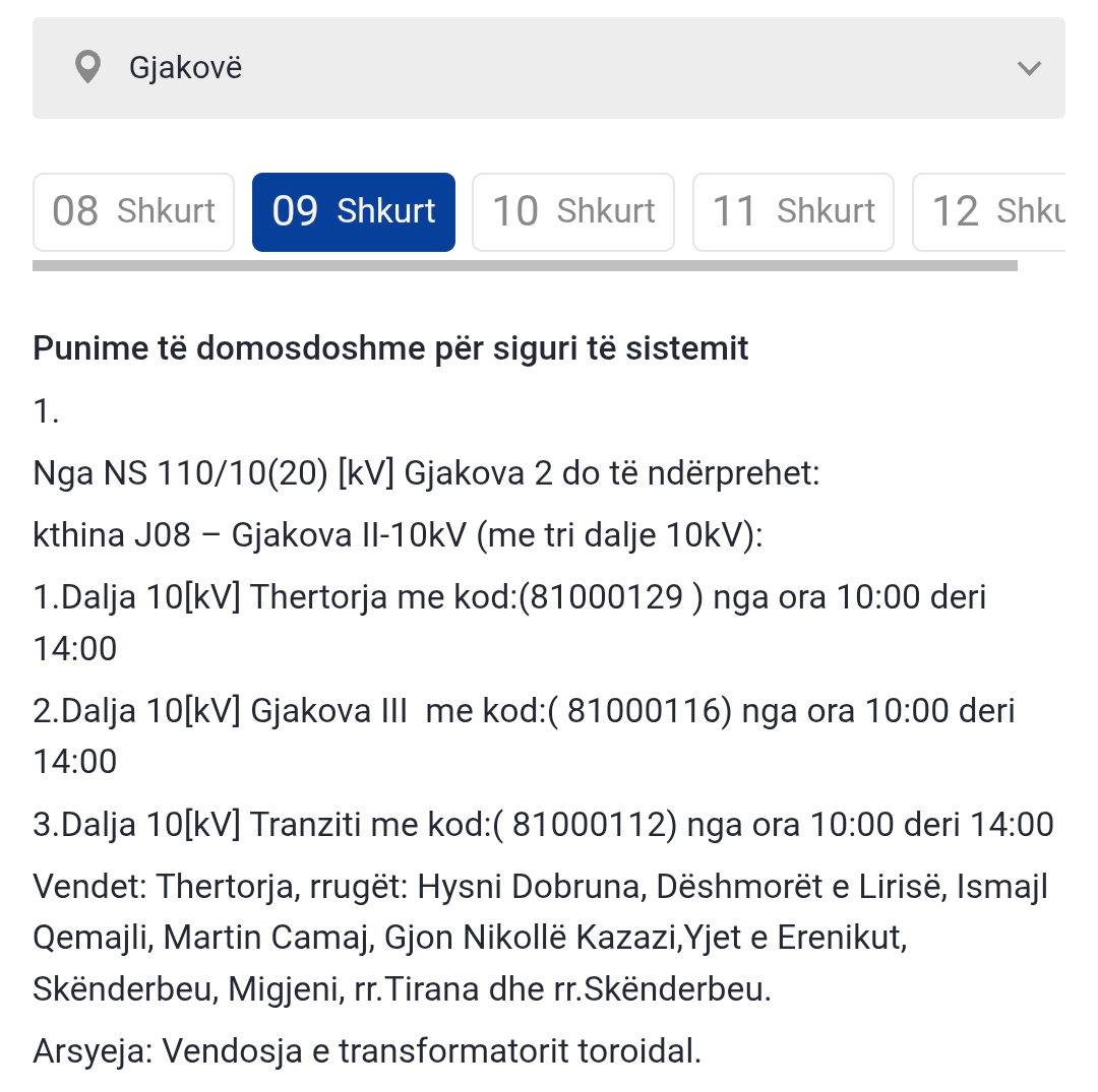 Më poshtë lista e plotë e vendeve që mbesin pa rrymë: