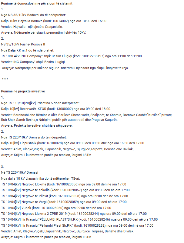 Për shkak të punimeve nga KEDS, disa vende të Kosovës do të mbesin pa rrymë të mërkurën.