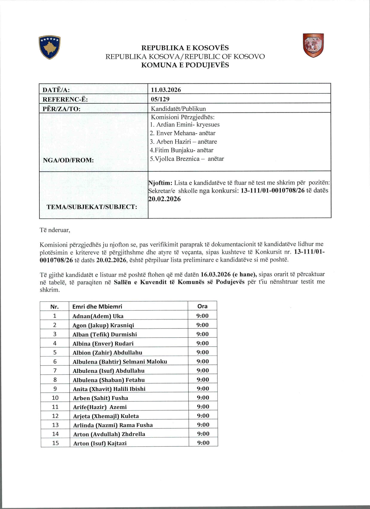 Komuna e Podujevës ka publikuar listën e të ftuarve në test me shkrim për pozitën “Sekretar/e Shkolle”.