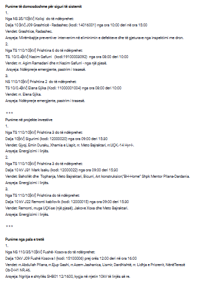 Për shkak të punimeve nga KEDS, disa vende do të mbesin sot (e enjte) pa rrymë.
